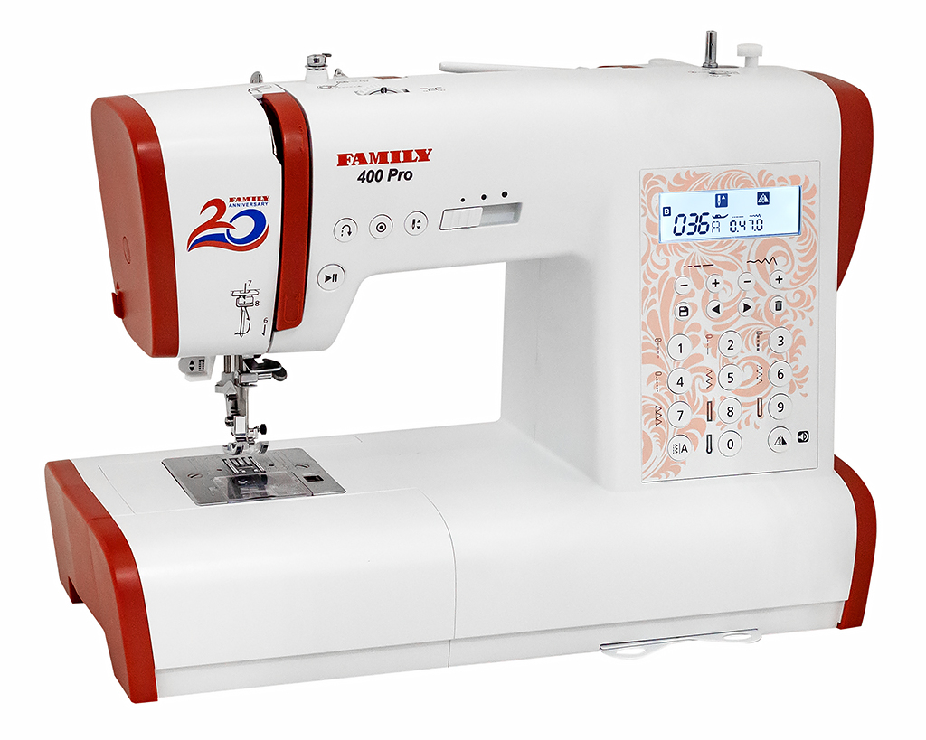 Серия Pro компании Family пополнилась новой моделью! Это электронная швейная машина Family 400 Pro, выпущенная специально к 20-летнему юбилею компании Family на российском рынке. Уже знакомый и полюбившийся многим дизайн машин Pro в более ярком исполнении: белый матовый корпус и контрастные красные детали. В ней есть всё, что нужно для комфортной, продуктивной работы и для реализации вашего творческого потенциала: 485 швейных операций, среди которых очень богатый выбор всевозможных строчек, петель для пуговицы и несколько алфавитов; целый ряд функций для более легкого шитья; удобный и тихий горизонтальный челнок; стабилизатор усилия прокола иглы, который позволяет получать качественную строчку на любых видах ткани. Простое управление машиной осуществляется с помощью всего нескольких кнопок и дисплея, на котором отображаются все важные параметры: номер строчки, ширина, длина, рекомендуемый вид лапки и другие установки. Эксклюзивная модель Family 400 Pro включает не только расширительный столик и набор аксессуаров с 7 лапками для различных операций, но и подарочный набор швейных принадлежностей!